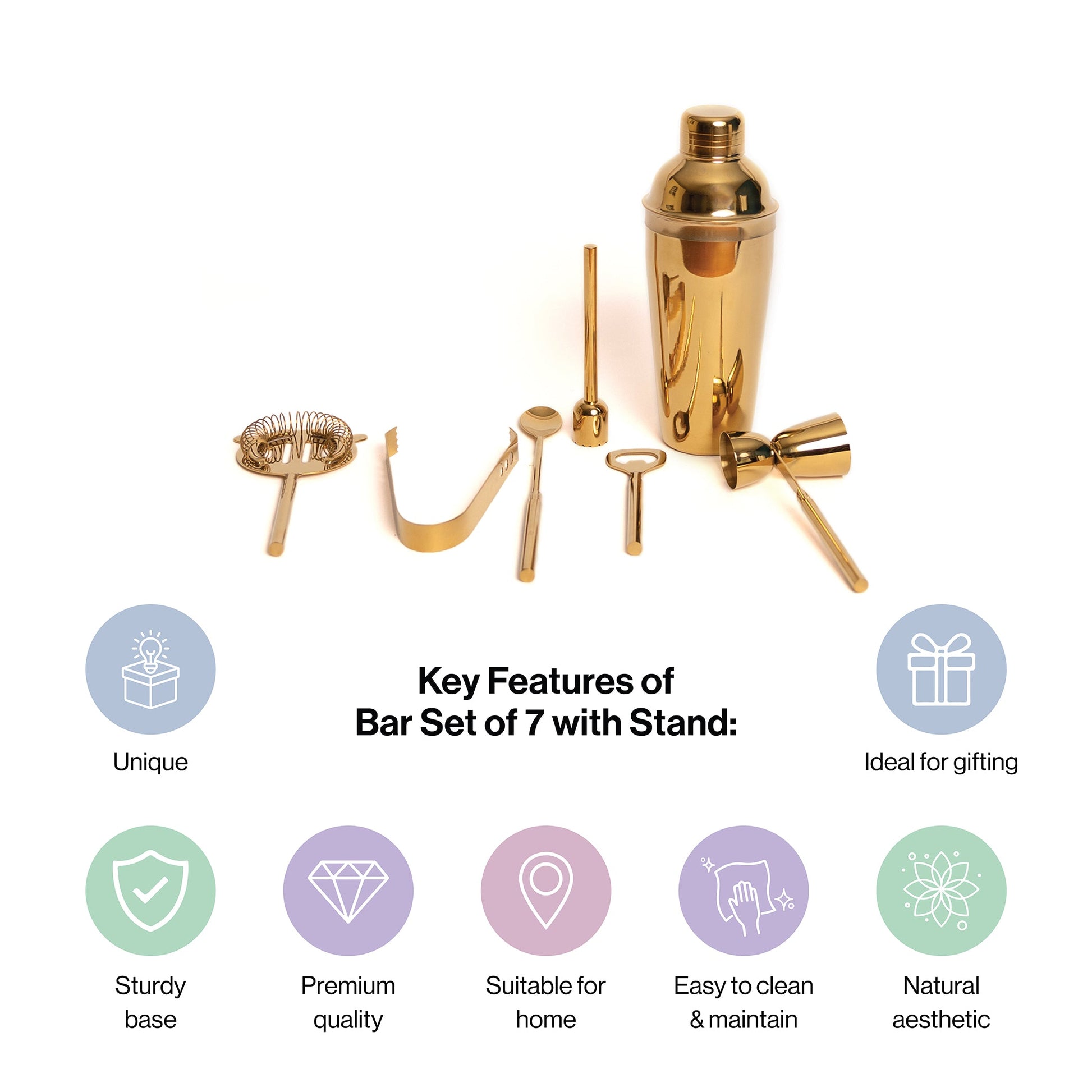 Craftsmanship: One of the first vital aspects of our bar set of 7 gold PVD coated for kitchen decor is associated with its fine craftsmanship. From the use of contemporary styling, to the use of unique lustre on the body of the bar set elements, this makes it look unique and hence elevates its essence. Having this bar set of 7 gold PVD coated for kitchen decor in your home will definitely add to your homeware beauty.