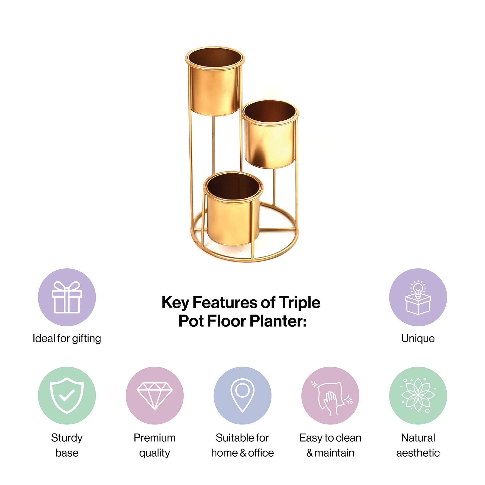 Design: This floor planter stand with triple pots in gold finish features a very glamorous design, that is both chic and minimalist. The opulence on this floor planter stand will make for an eclectic and stylish interior. This makes this floor planter stand a combination of stylish and functionality for adding to your homes.