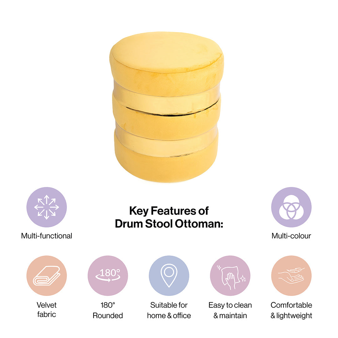 Easy to Clean: Another important feature of this round drum ottoman in marigold is the fact that it is very easy to clean. This is perfect for homes that thrive on low maintenance furniture. Our beautiful round drum ottoman in marigold has been provided with washable covers that can be easily removed and managed.