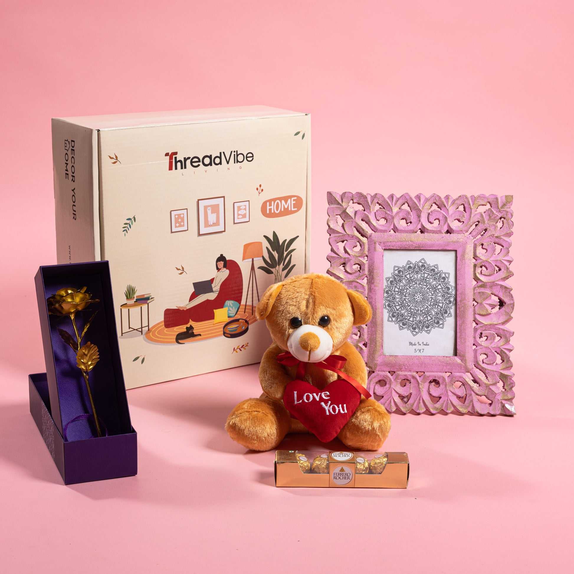 Elevate the beauty of Valentine's Day, with our special sweet memories valentines day combo. This is the perfect Valentine’s Day gift hamper to get for your partner, and impress them. This is the perfect Valentine’s Day gift hamper as it consists of a combination of the perfect gift items that will help you create the most beautiful and ever lasting memories. This sweet memories valentines day combo comprises a combination of four beautiful valentine’s day gifts. Starting with the most stunning golden rose, this will surely give the valentine’s day celebration more meaning. Our sweet memories valentines day combo also comes with the sweetest and cutest looking teddy bear and a box of the most premium chocolates. It also comes with a perfect and rare wooden hand carved photo frame, to help store all your sweet memories. This sweet memories valentines day combo will be exactly what you need for the valentine day celebrations this year.